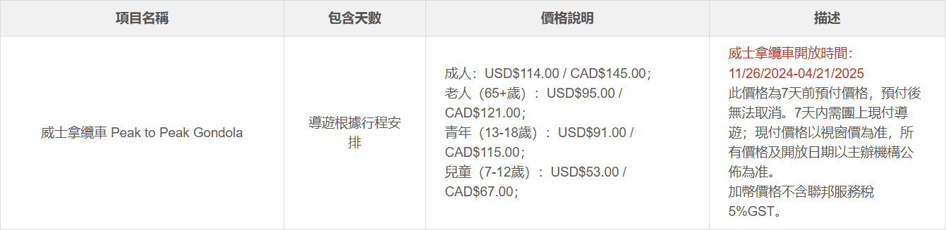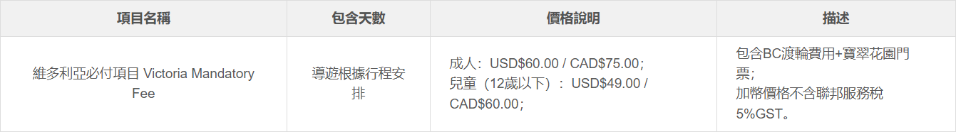 - 服務費(每人每天最低支付USD$12美金/CAD$15加幣,兒童及占座嬰兒均按成人標準支付);