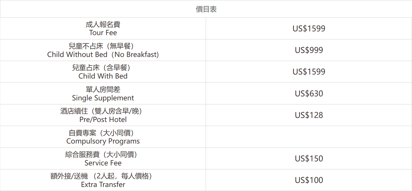 價格 & 出發日期 請參考行程彩頁,最終確認報價以公司銷售人員所述為準。