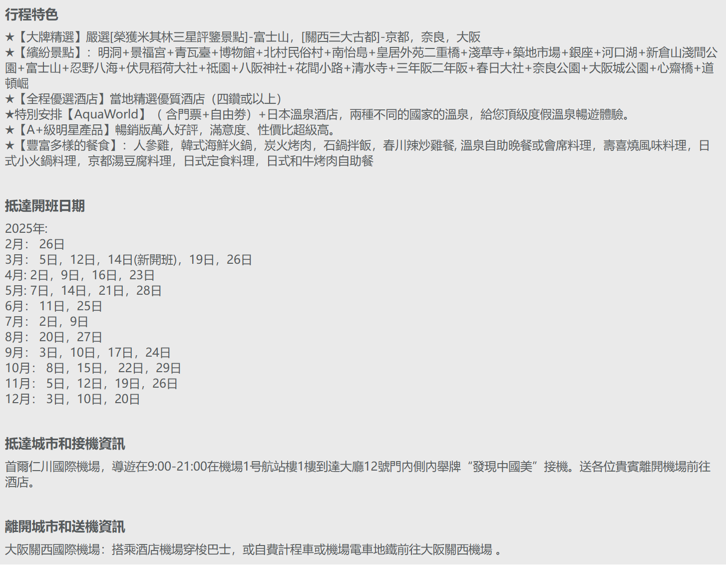 - 其他未盡事宜請諮詢組團社,凡報名之客人均視爲瞭解/接收我公司之旅遊條款。