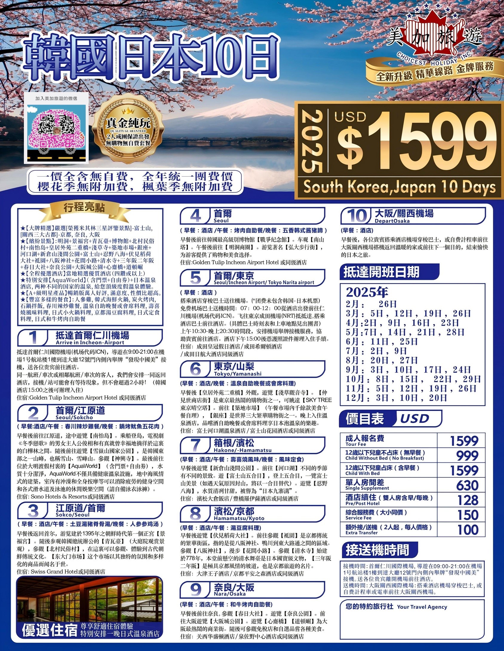 - 單人房差、酒店續住價格、額外接送收費價格:請參考各線路網站標注以及廣告單頁。