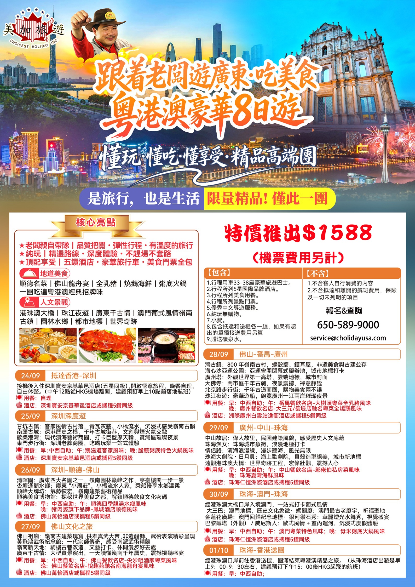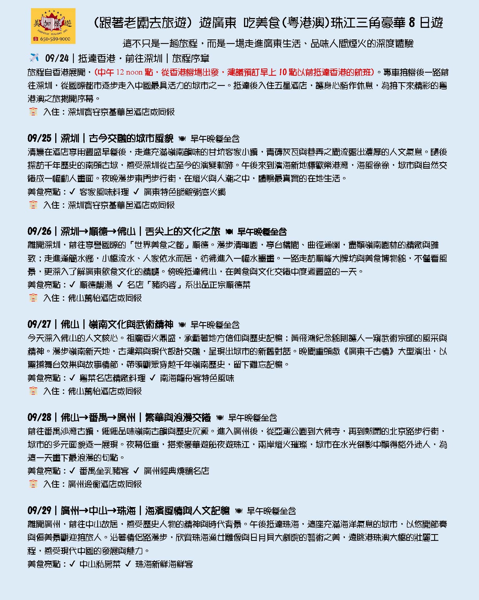 (跟著老闆去旅遊) 遊廣東 吃美食(粤港澳)珠江三角豪華8日遊(09/24/2026 抵達香港/深圳)