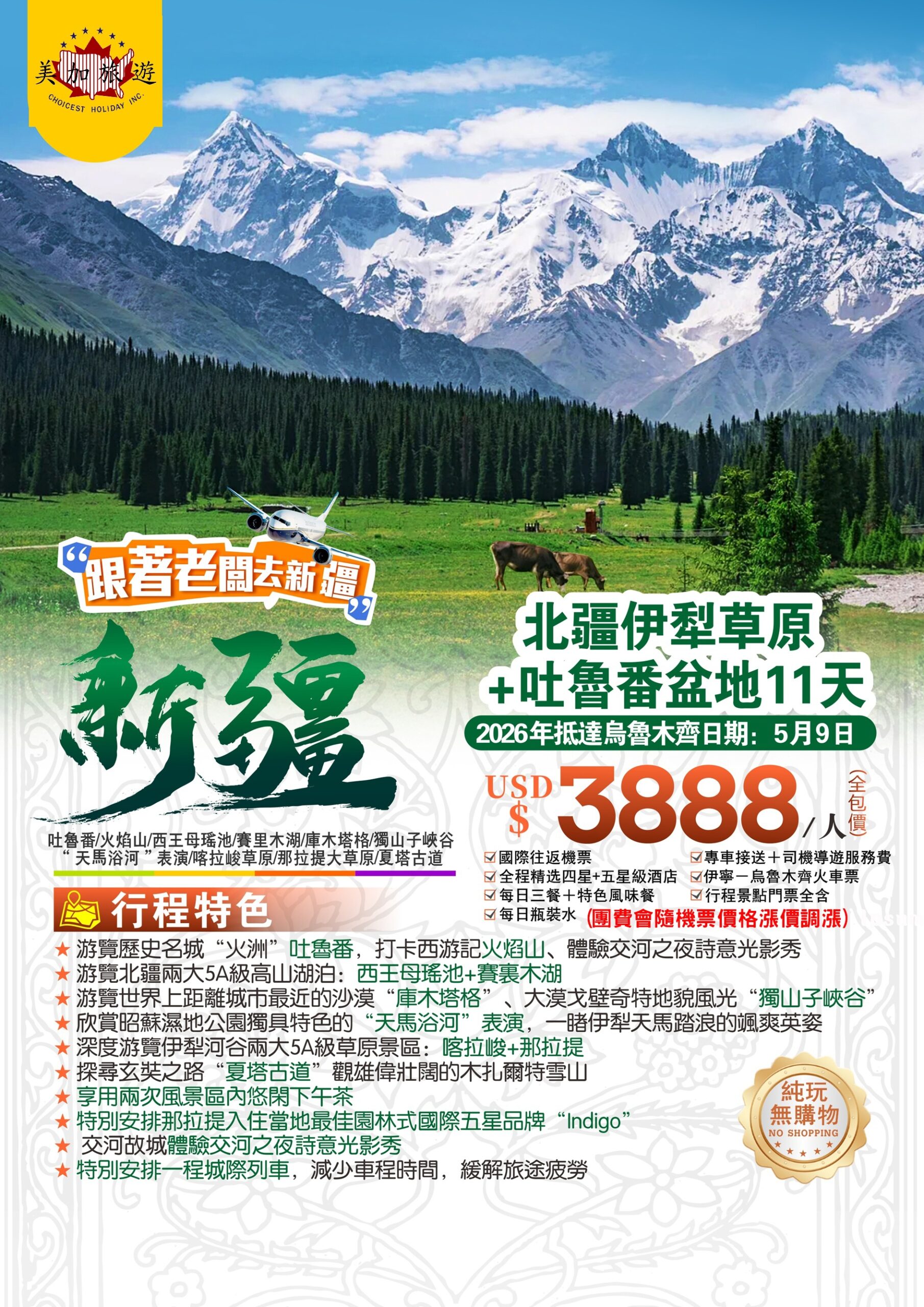 - 特色安排:特別贈送天池電瓶車、坎兒井參觀、賽里木湖環湖遊等精緻體驗,全程升級舒適住宿,兼顧觀光與休閒。