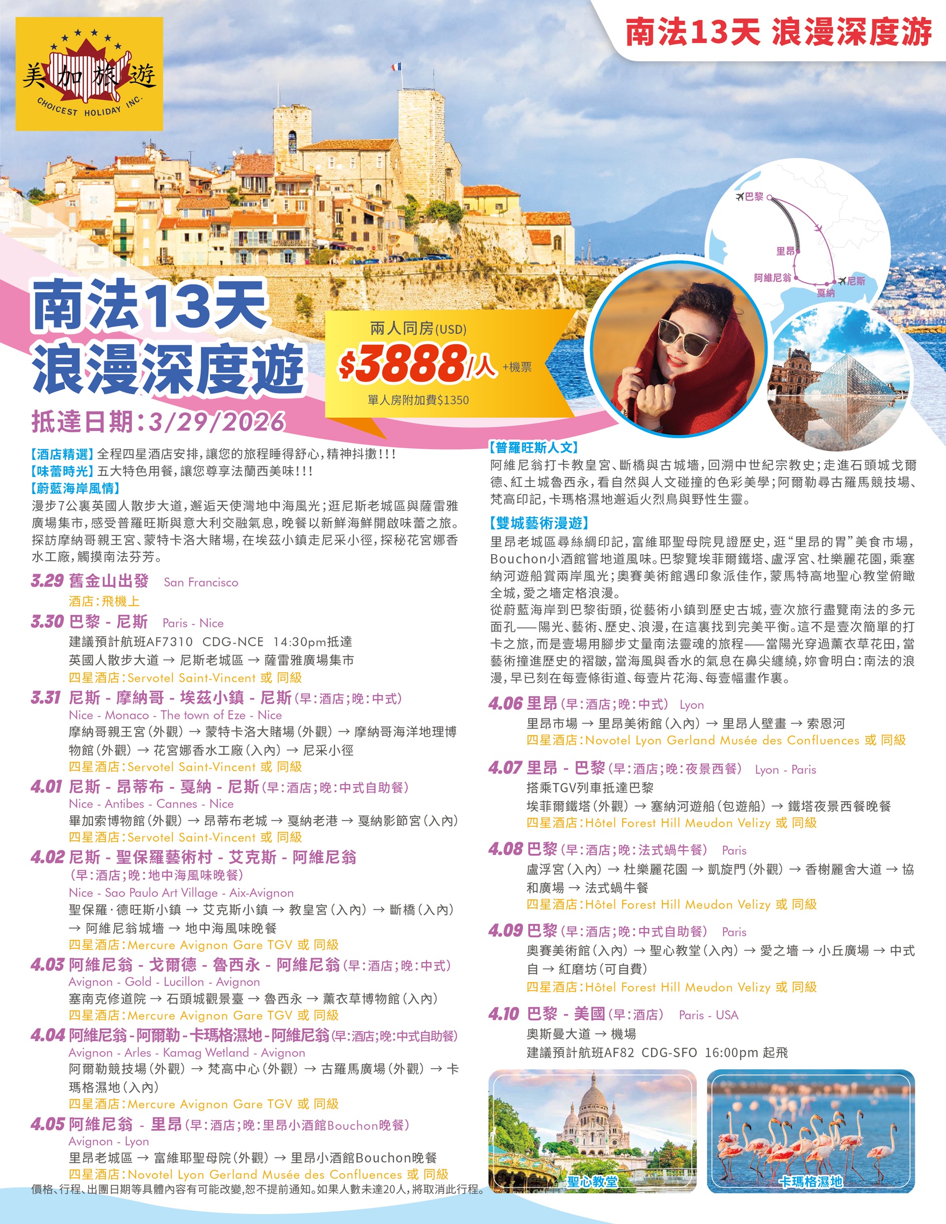 第1天3/29/2026(日) 美國 ✈ 法國尼斯(建議預定航班AF7310 CDG-NCE 14.30pm抵達)
