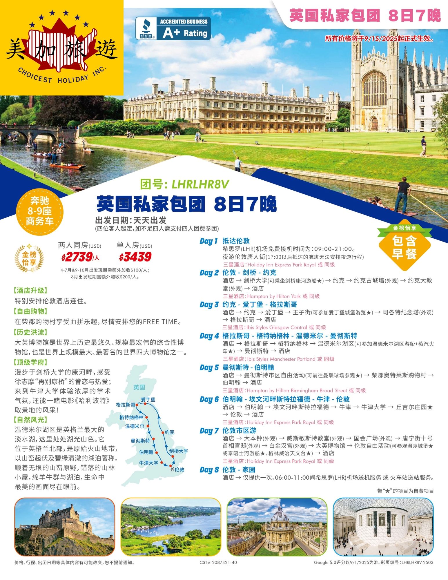 4-7月&9-10月出發班期需額外加收$100/人;8月出發班期需額外加收$200/人。