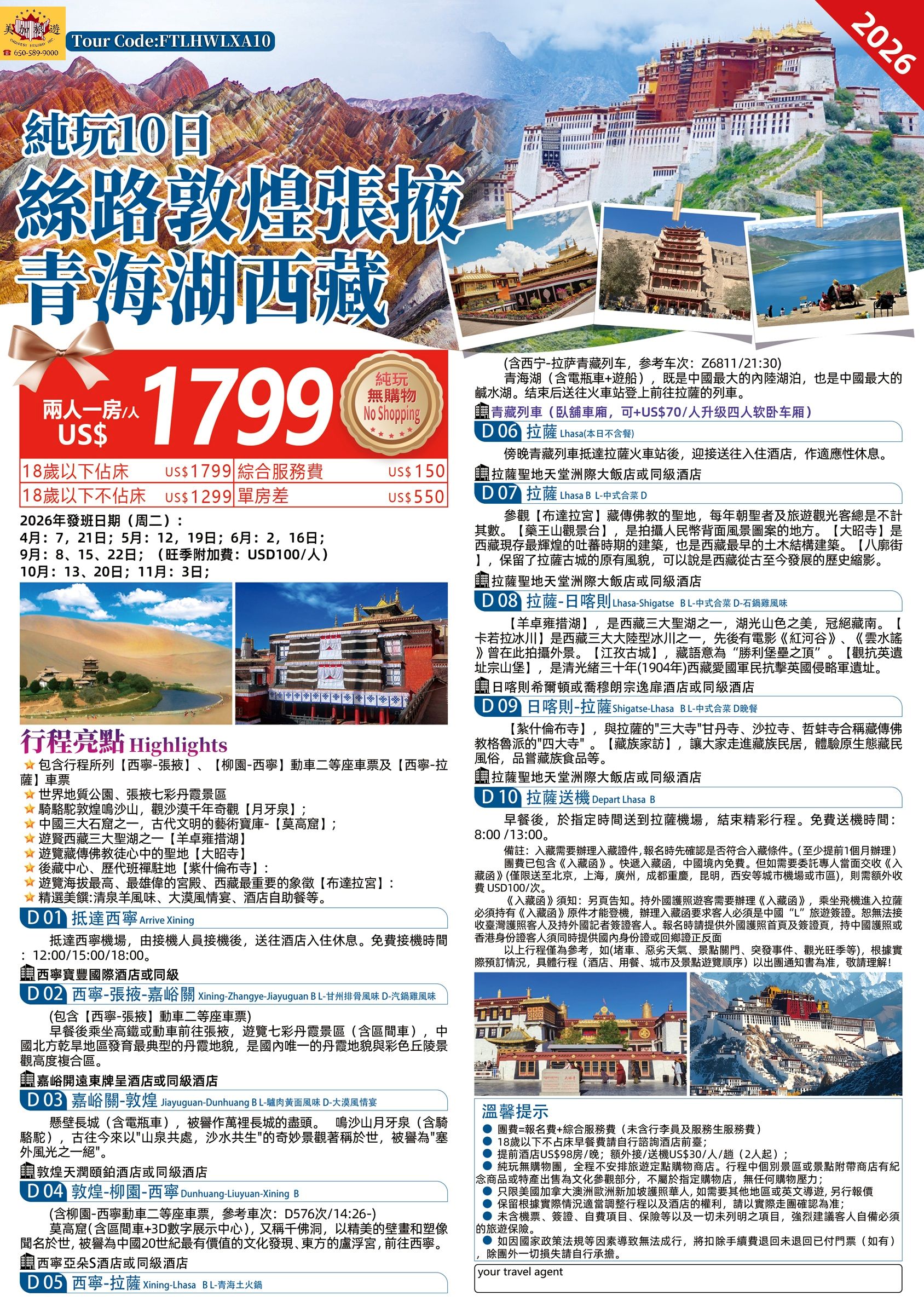 中國 (純玩無購物)絲路敦煌張掖青海湖西藏10天(2026)