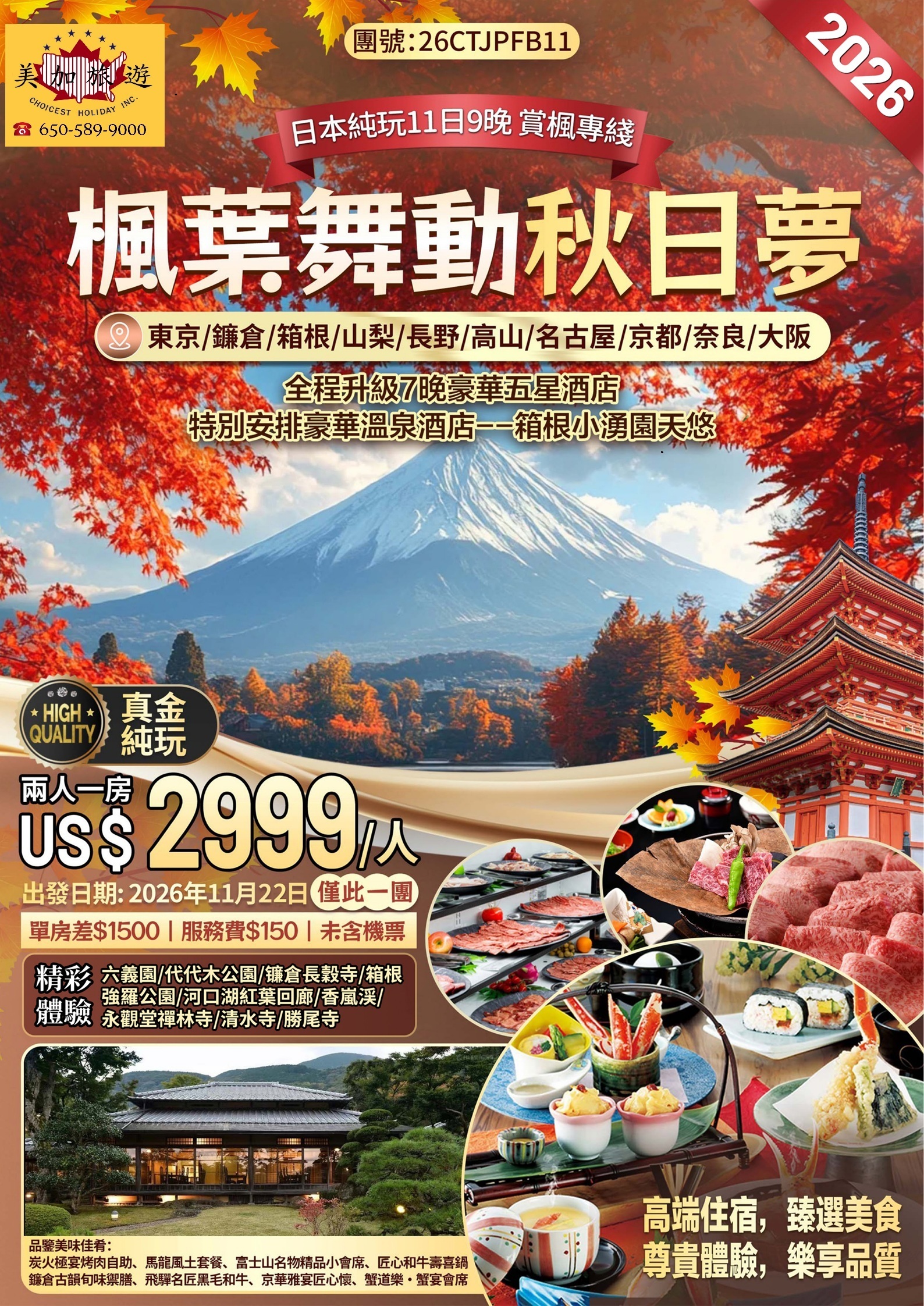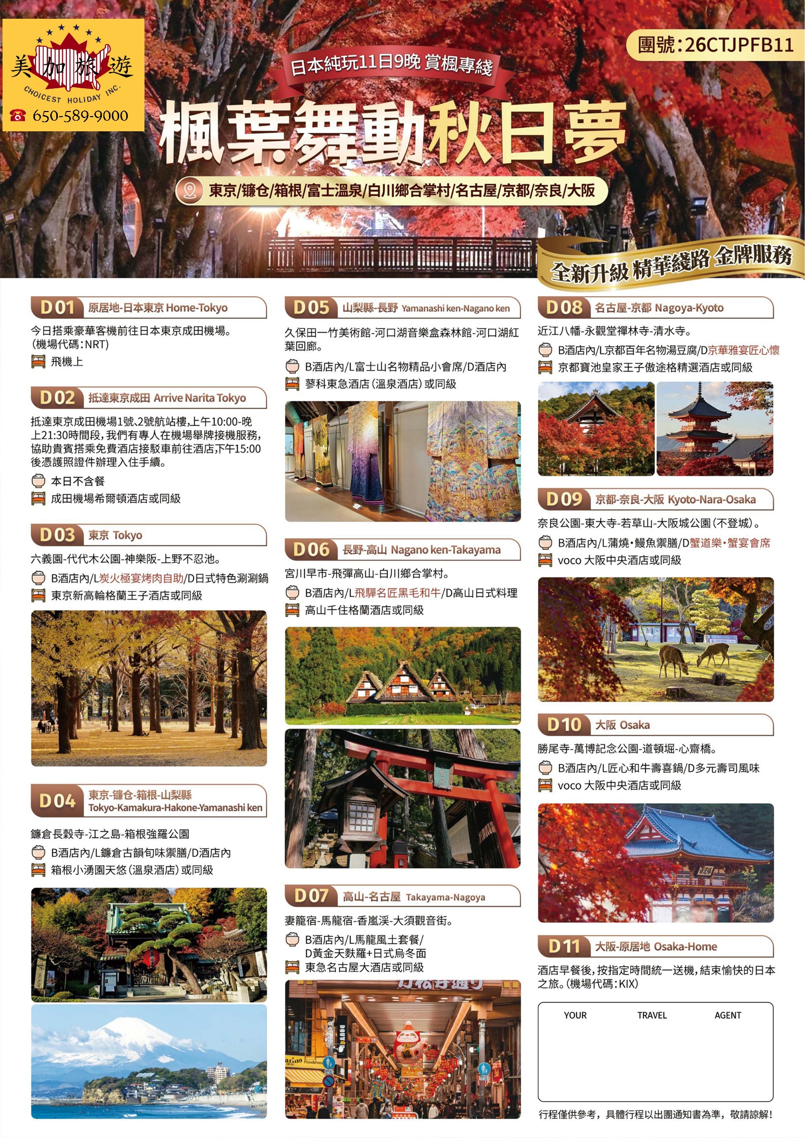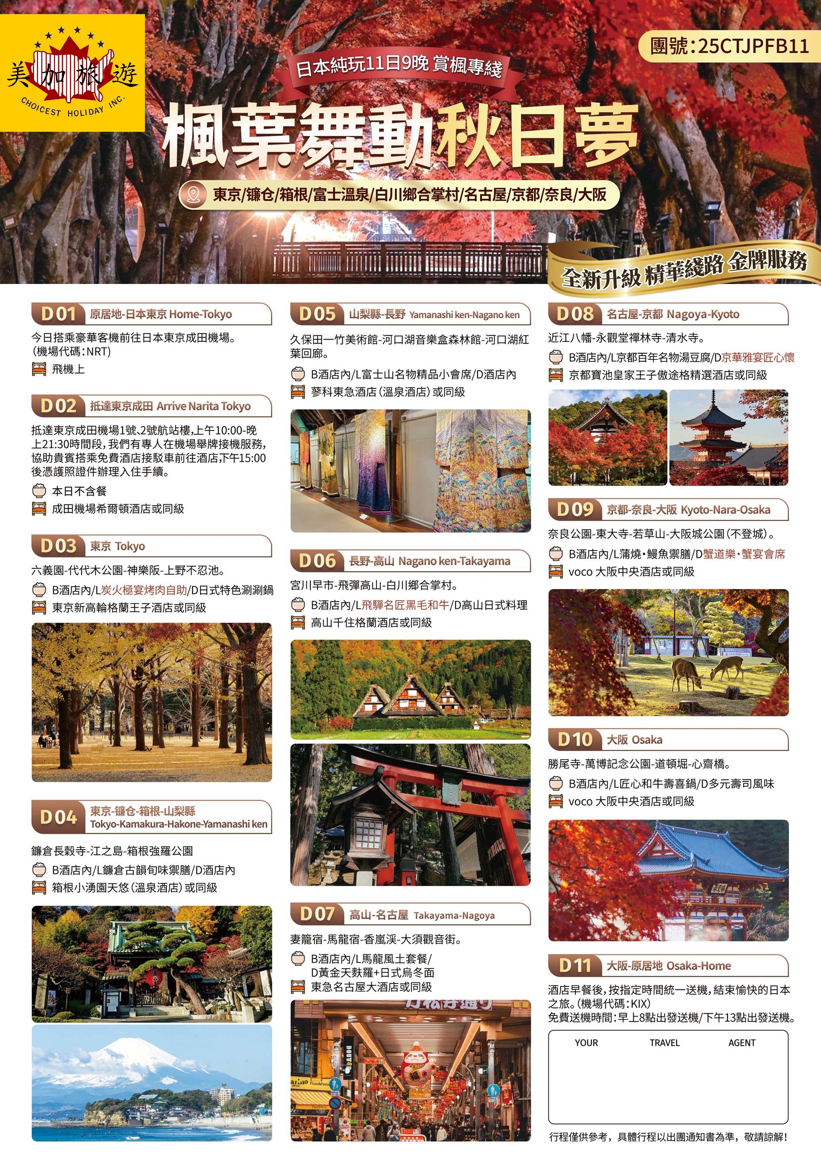 東京、箱根、富士山、白川鄉、京都、奈良、大阪,串聯經典與秘境,楓紅層層堆疊,如詩如畫。