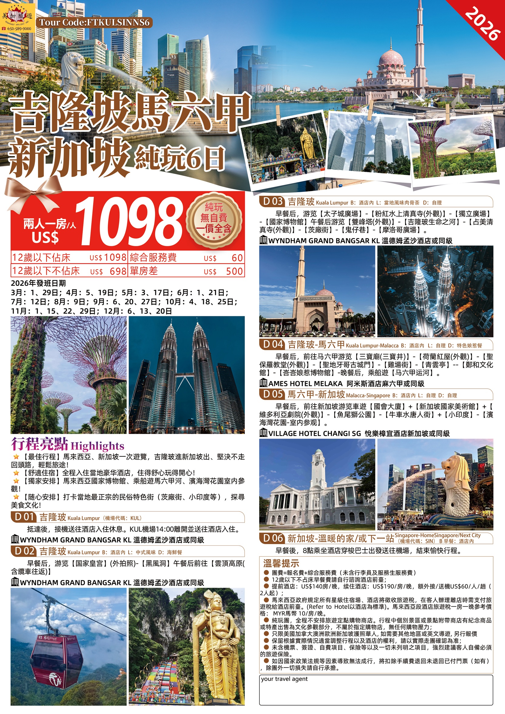 吉隆坡、馬六甲、新加坡三大明星城市一次到位!純玩不進購物站,六天帶您走進南洋最迷人的文化、美景與城市節奏。五星住宿、熱門打卡點、歷史古蹟、美食盛宴全收錄,一次滿足「第一次南洋旅行就該這樣玩」的完美期待。
