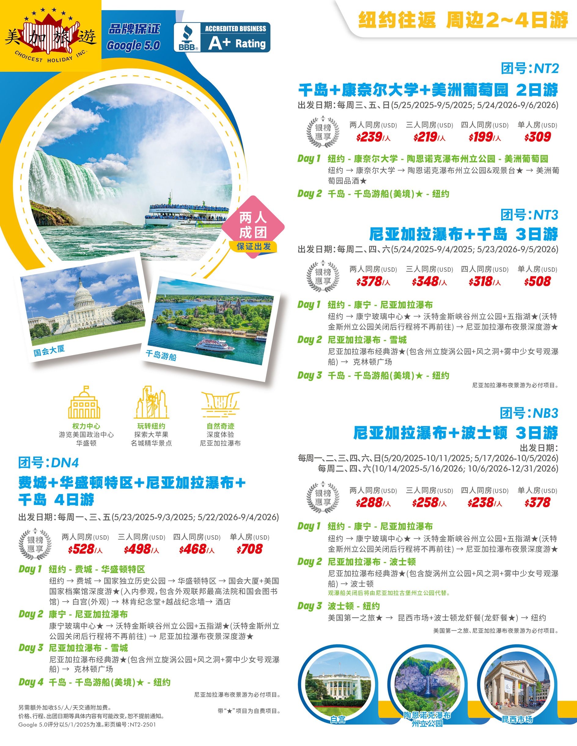 | 尼亞加拉瀑布經典遊 Niagara Falls Classic Tour | 成人:$75.00;老人(65+歲):$75.00;兒童(3-12歲):$65.00; |