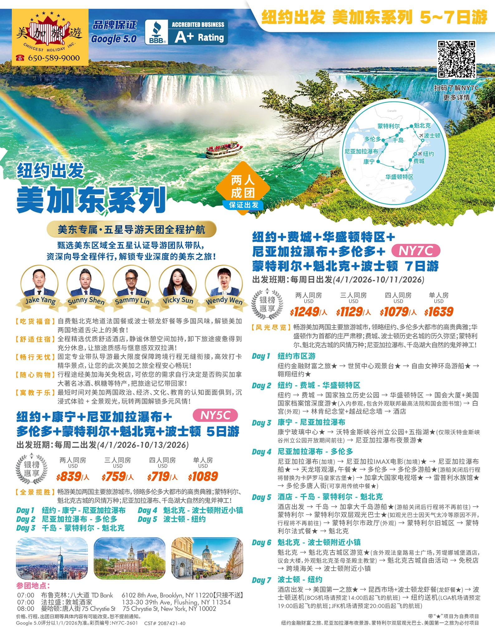 - 07:00出發 【只接不送】布魯克林:八大道 TD Bank;6102 8th Ave, Brooklyn, NY 11220。註意:此上車地點只接不送,回程將客人送到唐人街。