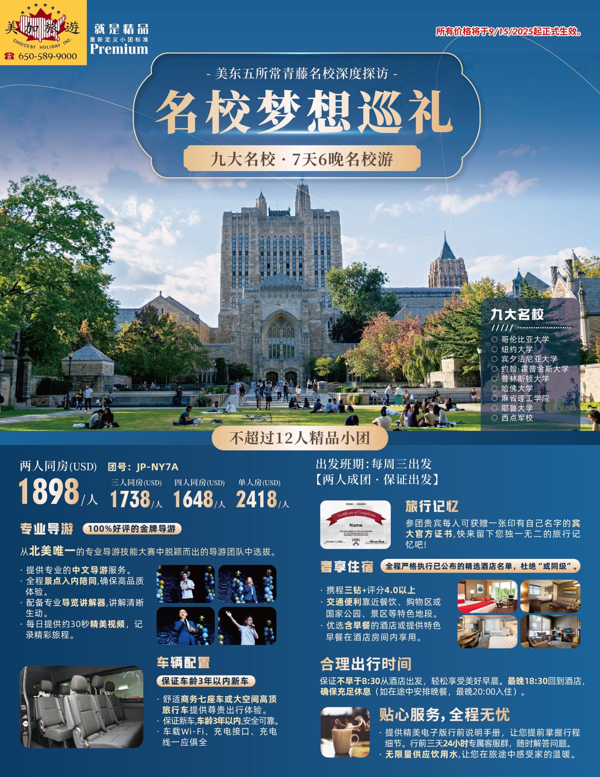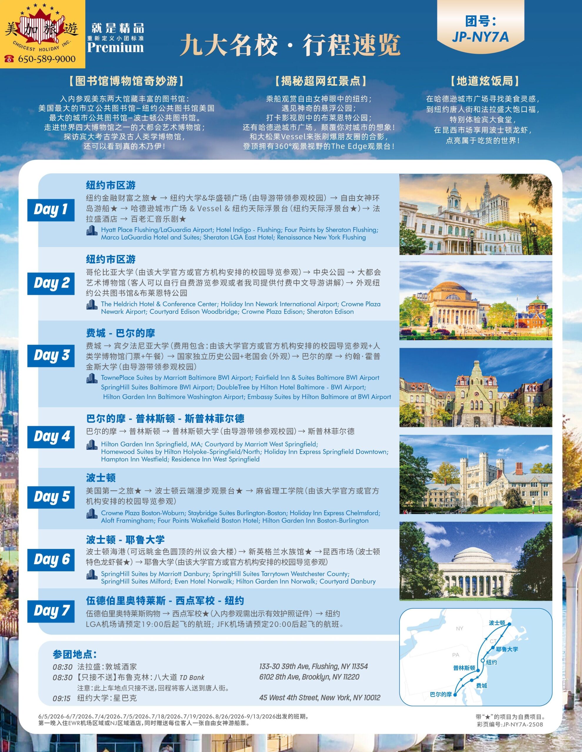 美東 NY7A紐約+費城+巴爾的摩+普林斯頓+劍橋+波士頓+紐黑文+西點 7天暢遊美東九大名校(2026)