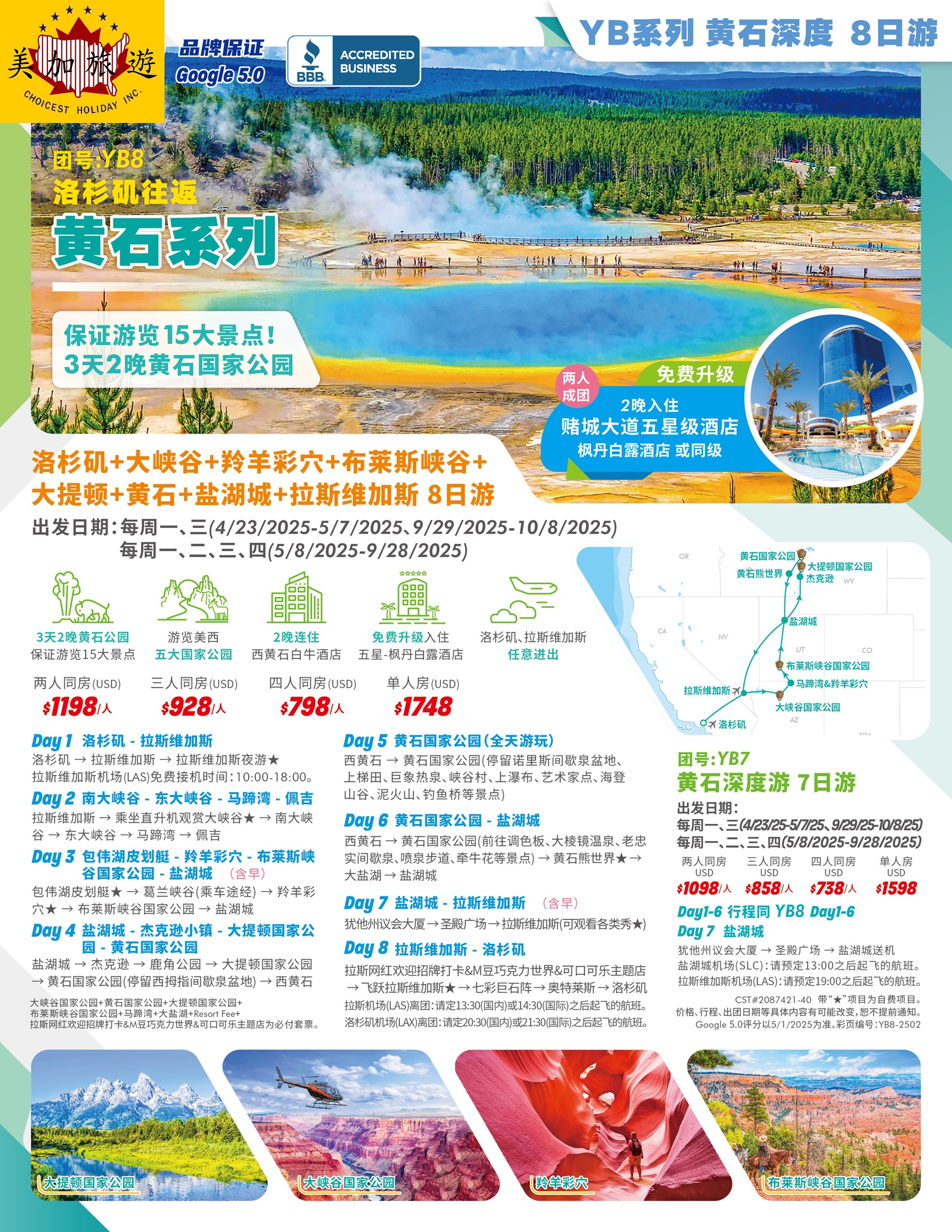YB7: 每人$225.00 :大峽谷國家公園、黃石國家公園、大提頓國家公園、布萊斯峽谷國家公園、馬蹄灣、大鹽湖、拉斯維加斯酒店Resort Fee/Destination Fee。