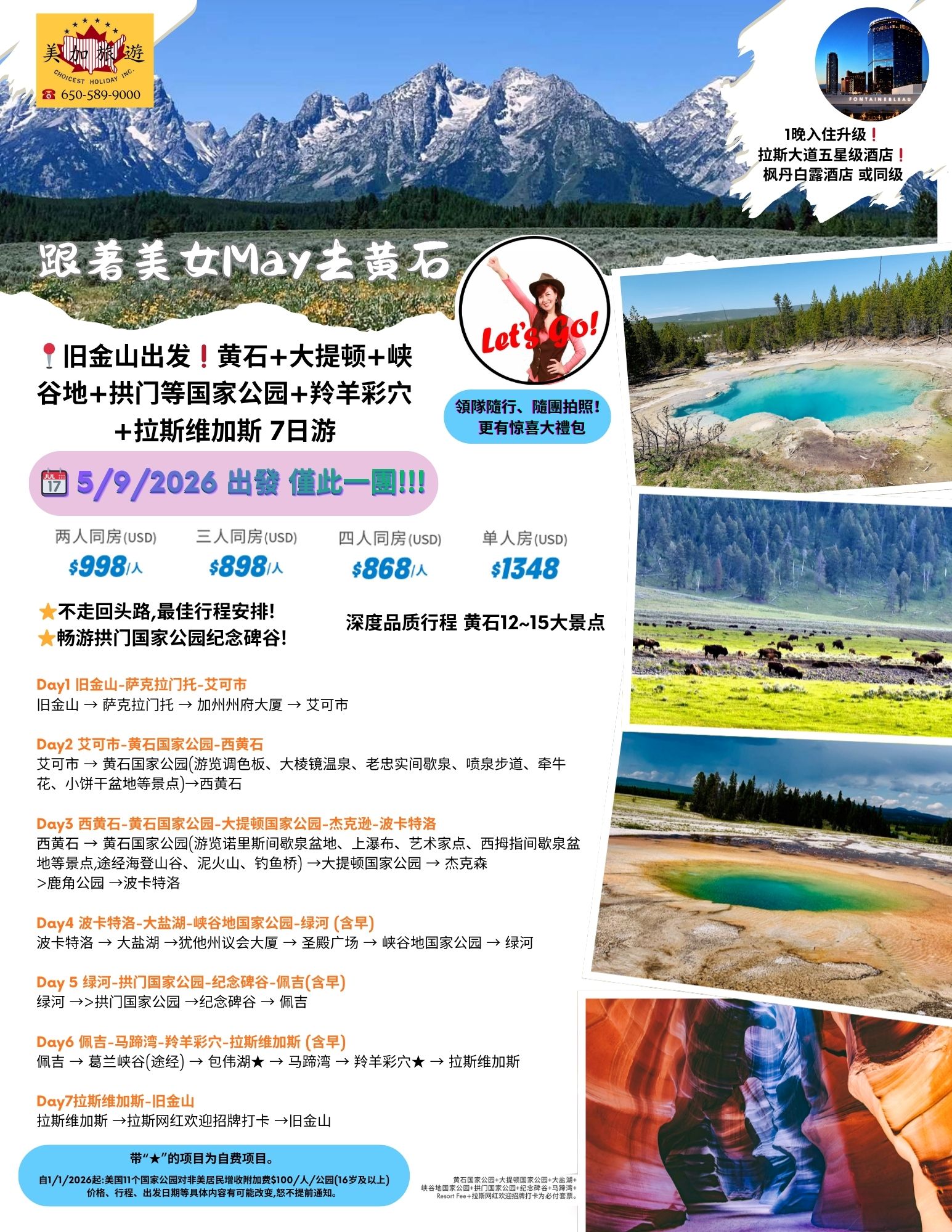 包含:黃石國家公園、大提頓國家公園、大鹽湖、峽谷地國家公園、拱門國家公園、紀念碑谷、馬蹄灣、拉斯維加斯酒店Resort Fee/Destination Fee、拉斯網紅歡迎招牌打卡 |