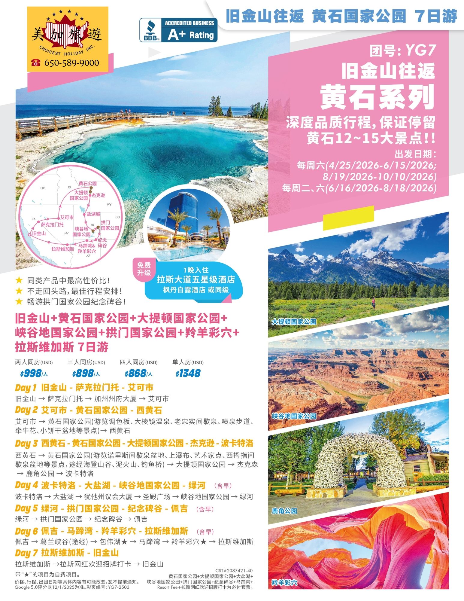 包含:黃石國家公園、大提頓國家公園、大鹽湖、峽谷地國家公園、拱門國家公園、紀念碑谷、馬蹄灣、拉斯維加斯酒店Resort Fee/Destination Fee、拉斯網紅歡迎招牌打卡