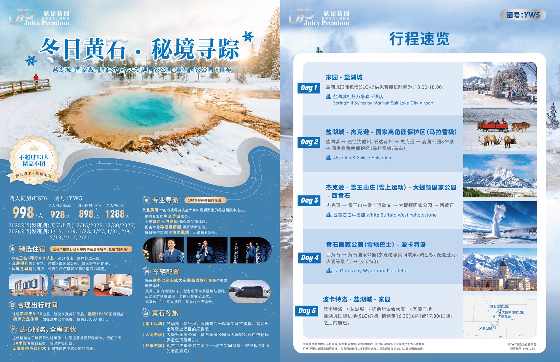 包含:國家高角鹿保護區馬拉雪橇/雪車乘坐體驗、大提頓國家公園、黃石國家公園&雪地巴士