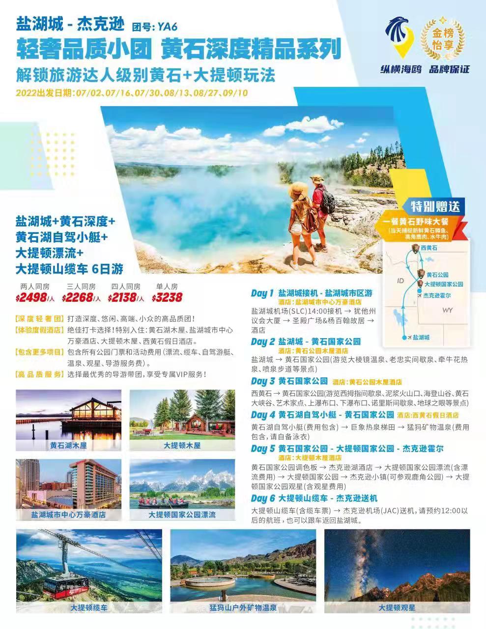 早晨由鹽湖城出發,驅車前往世界第一個國家公園-黃石國家公園。沿途無邊的草原丘陵;漫山遍野的牛羊;高聳入雲的雪山;徜徉不息的河流;勤勞的牛仔無不令人心曠神怡。七彩繽紛大棱鏡熱泉、世界聞名老忠實、浪漫迷人的牽牛花熱泉… 精彩會一個個接踵而來!